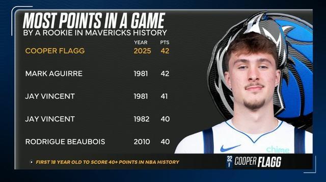 据统计,弗拉格的42分追平了独行侠队史的新秀得分纪录,此前的保持者是独行侠名宿马克-阿吉雷。而在独行侠队史新秀得分榜上,东契奇甚至没有进入前五名。